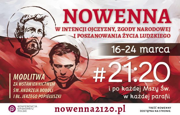 Przewodniczący Konferencji Episkopatu Polski abp Stanisław Gądecki zaprasza do włączenia się w modlitwę nowennową „Akcja 21:20”. Będzie to odmawiana po Apelu Jasnogórskim modlitwa w intencji Ojczyzny, zgody narodowej i poszanowania życia ludzkiego, zanoszona za wstawiennictwem św. Andrzeja Boboli i bł. ks. Jerzego Popiełuszki. Nowenna rozpocznie się 16 marca a zakończy 24 marca, przed przypadającym 25 marca Dniem Świętości Życia.