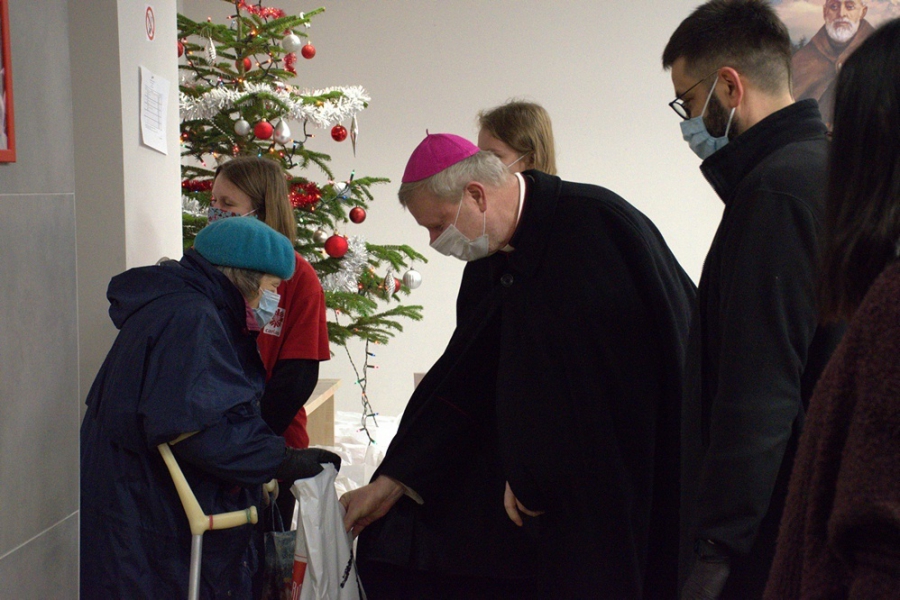 Spotkanie wigilijne rozpoczęło się o godz. 9 wspólną modlitwą na naszym placu przy siedzibie Caritas w Sopocie, którą poprowadził bp Wiesław Szlachetka. Pobłogosławił opłatki, które otrzymywały osoby potrzebujące. Następnie, z zachowaniem wszystkich zasad sanitarnych, odbyła się dystrybucja paczek w siedzibie jadłodajni. Potrzebujący otrzymali dwie paczki. Pierwsza zawierała zestaw dań wigilijnych, w drugiej znalazła się żywność trwała. Paczki wręczał m.in. bp Wiesław Szlachetka.