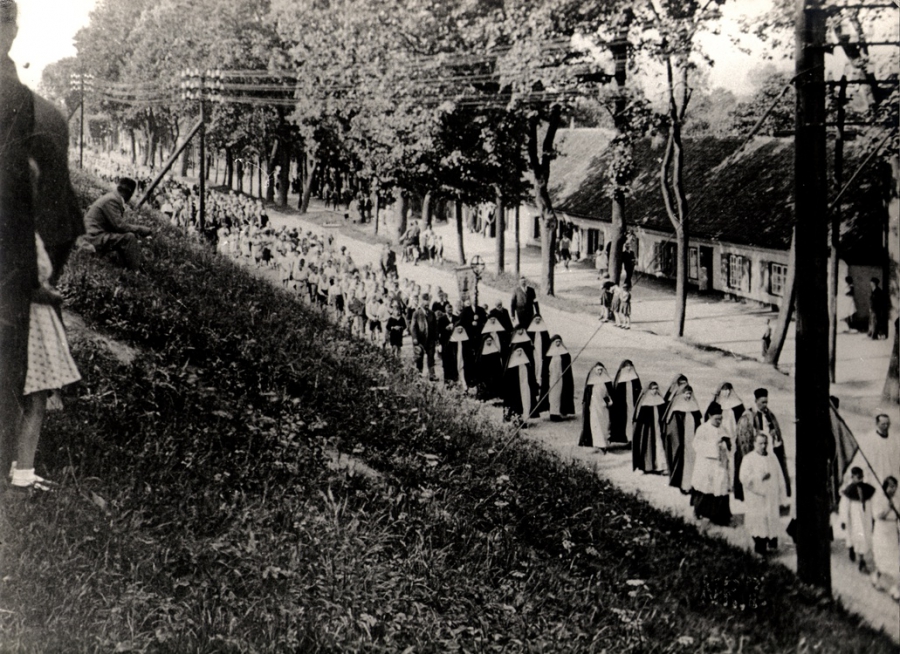 Zdjęcie pielgrzymki Polaków katolików z 1935 roku. Na czele pochodu bł. ks. Franciszek Rogaczewski, proboszcz polskiej parafii pw. Chrystusa Króla w Wolnym Mieście Gdańsku.