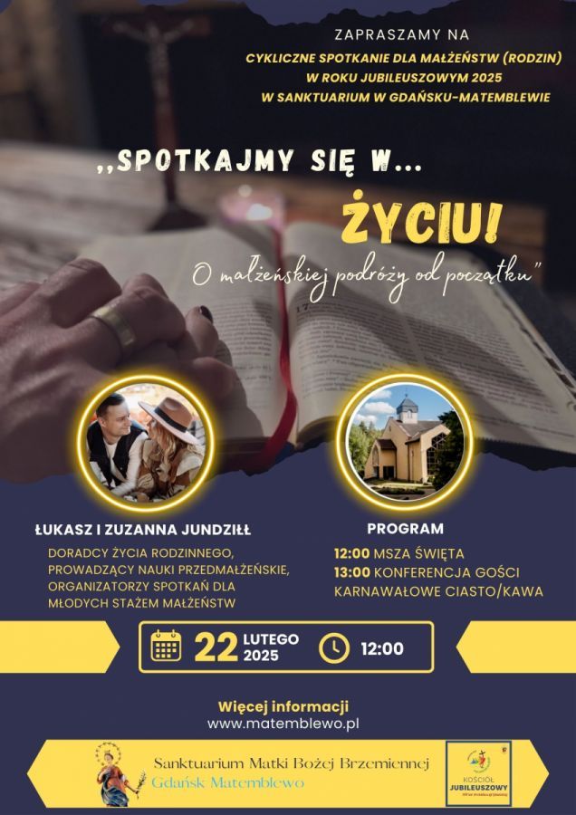 Z okazji Roku Jubileuszowego zapraszamy do matemblewskiego sanktuarium na cykliczne spotkania dla małżeństw - w każdą ostatnią sobotę miesiąca.