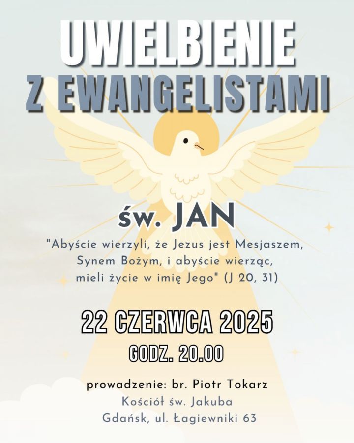Podczas modlitwy oddamy chwałę Bogu dziękując Mu za otrzymany dar wolności w Chrystusie. Do uwielbienia zaprosimy św. Jana Ewangelistę. W świetle jego relacji Jezus daje nam udział we własnym życiu i w swojej więzi z Ojcem. Tym, który wiąże nas z Jezusem i z Ojcem, i między sobą, jest Duch Święty. Każdy z nas został zaproszony do głębokiej relacji z Jezusem a przez Niego z Ojcem w Duchu Świętym, który został nam dany.