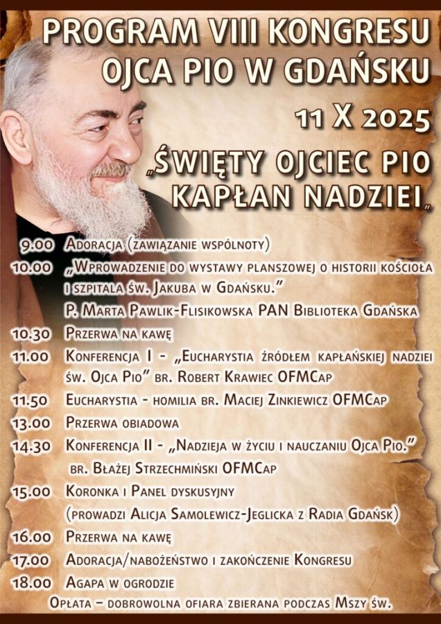 - 14.30 Konferencja II - „Nadzieja w życiu i nauczaniu Ojca Pio.” br. Błażej Strzechmiński OFMCap