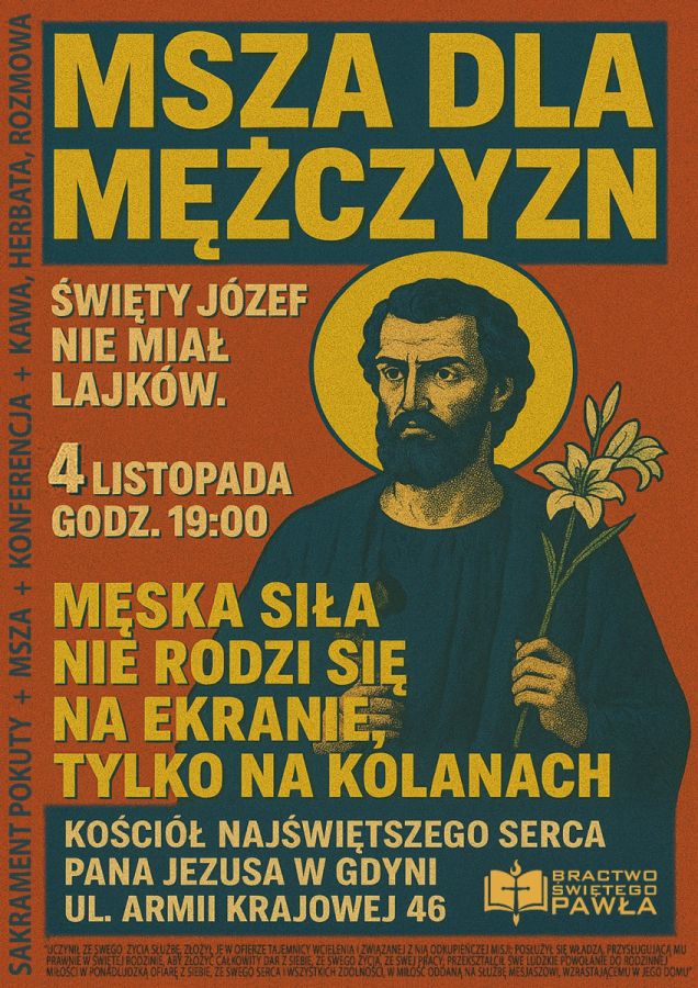 Bractwo Świętego Pawła zaprasza wszystkich mężczyzn na Mszę Świętą dla Mężczyzn. To wyjątkowy moment w miesiącu, kiedy mężczyźni z całej Archidiecezji Gdańskiej - niezależnie od wieku i życiowego powołania, gromadzą się, by wspólnie stanąć przed Bogiem, umocnić swoją wiarę i odkryć na nowo siłę, jaką daje męska modlitwa.