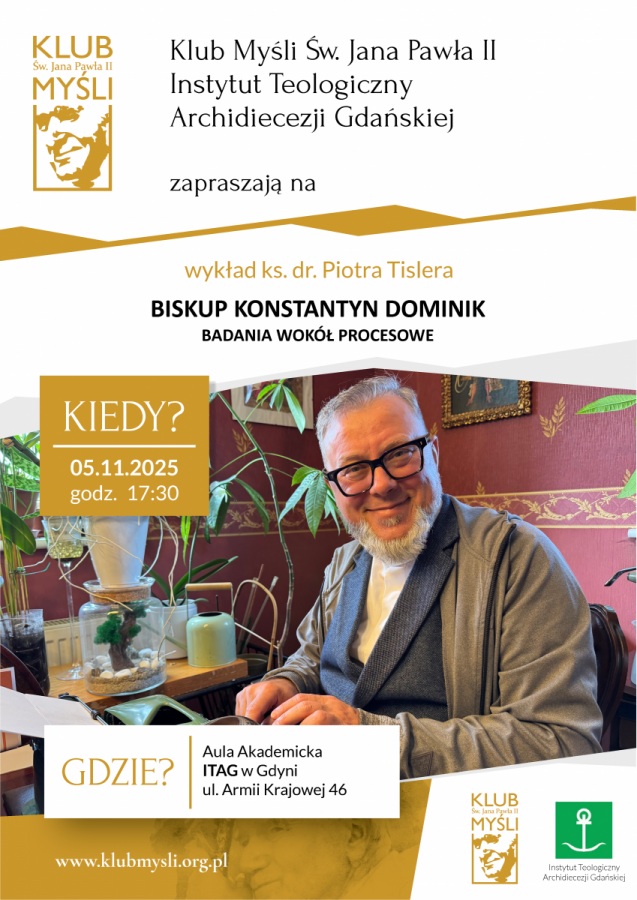 Instytut Teologiczny Archidiecezji Gdańskiej w Gdyni oraz Klub Myśli Jana Pawła II w Gdyni zapraszają na ostatnie już w tym roku spotkanie, które będzie poświęcone Słudze Bożemu biskupowi Konstantynowi Dominikowi, z okazji 155. rocznicy jego urodzin oraz 60. rocznicy rozpoczęcia procesu beatyfikacyjnego.