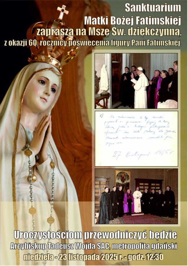 Sanktuarium Matki Bożej Fatimskiej w Gdańsku-Żabiance zaprasza na Mszę św. dziękczynną z okazji 60. rocznicy poświęcenia figury Matki Bożej Fatimskiej. Przewodniczyć jej będzie abp Tadeusz Wojda SAC, metropolita gdański.