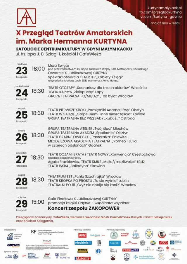 X Przegląd Teatrów Amatorskich im. Marka Hermanna KURTYNA 2025 organizowany przez Stowarzyszenie Katolickie Centrum Kultury (budujemykack.pl) w Gdyni Małym Kacku odbędzie się w dniach 23 - 29 listopada 2025 r.