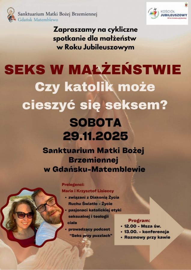 Zapraszamy do Sanktuarium Matki Bożej Brzemiennej w Matemblewie na cykliczne spotkanie dla małżeństw w Roku Jubileuszowym. Tematem nadchodzącego spotkania będzie "Seks w małżeństwie. Czy katolik może cieszyć się seksem?"