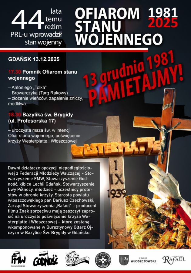 W 44. rocznicę wprowadzenia stanu wojennego w Polsce na Mszy Św. o godz. 18.30 w bazylice św. Brygidy w Gdańsku zostaną pobłogosławione dwa krzyże: z Westerplatte i Włoszczowy. Po Eucharystii o godz. 19.30 przedstawiciele Stowarzyszenia Godność, Federacji Młodzieży Walczącej, Lwów Północy, Solidarności, kombatantów AK, Kibiców Lechii Gdańsk, złożą kwiaty i zapalą znicze pod pomnikiem pierwszej ofiary stanu wojennego w Gdańsku śp. Antoniego Browarczyka "Tolka".